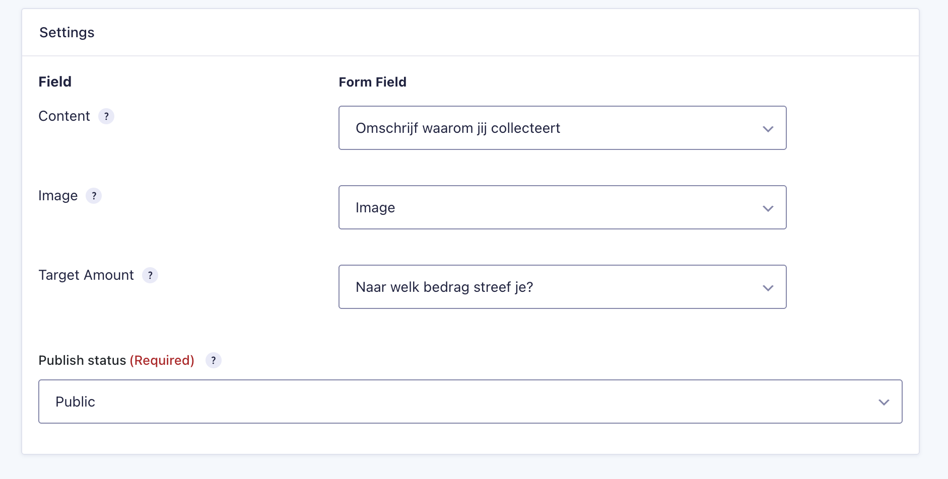 To let the form update salesforce date (like the target amount) set up a feed action with a Update or create record in Salesforce action. To update the correct campaign, an extra meta field is added by the plugin with the campaign ID of the campaign linked to the action: Action External ID