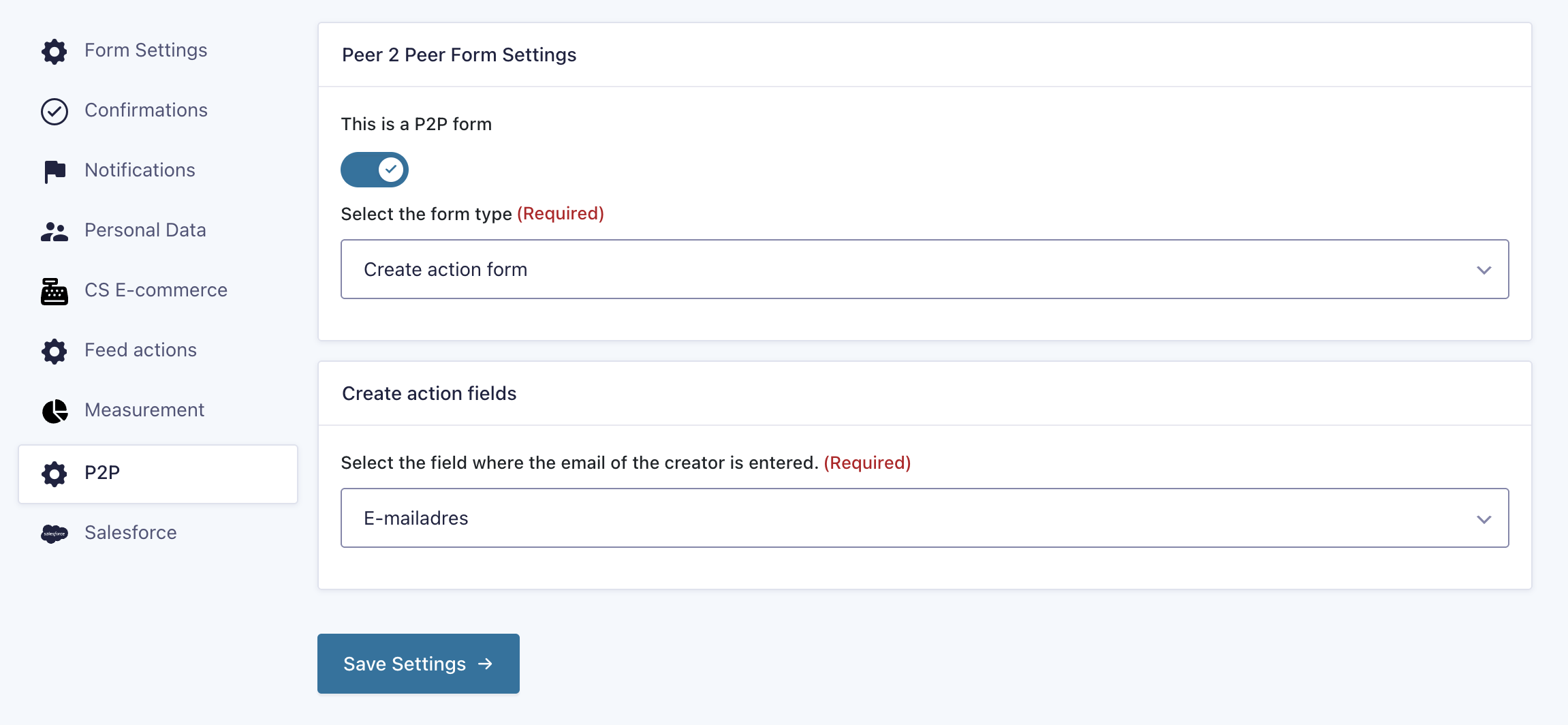 To set up the form go to Settings > P2P on the gravity form that used to create the Actions.